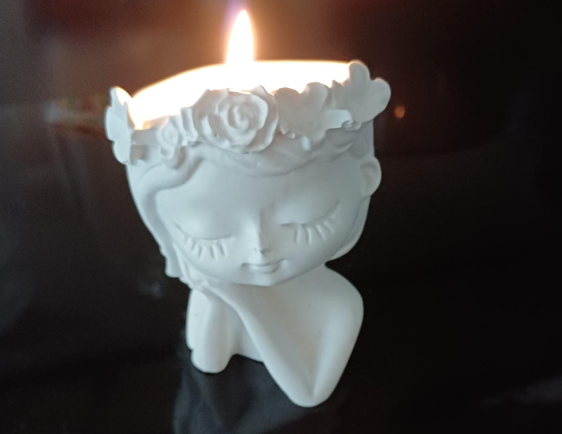 Meisje met bloemenkrans leuk om kaarsenzand in te doen of vullen met droogbloemen.