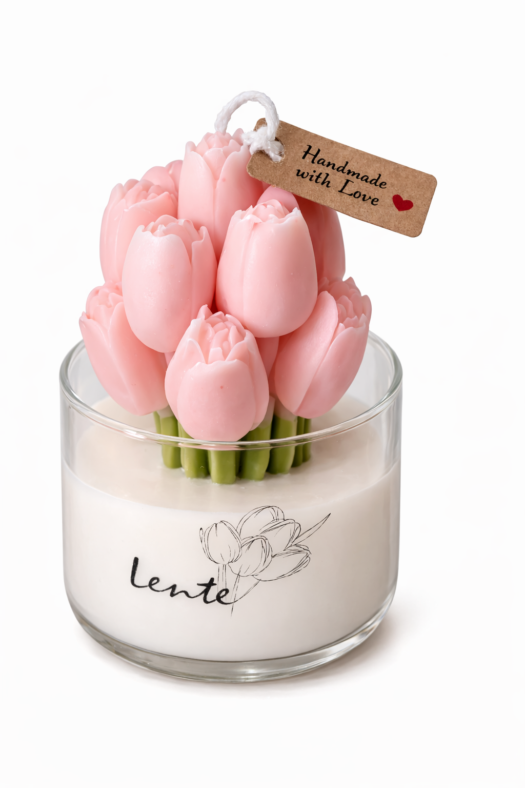 Breng een vleugje lente in huis met deze prachtige handgemaakte tulpenkaars in glas. De kaars is vormgegeven als een klein boeket roze tulpen en staat in een stijlvol glazen potje met een minimalistische illustratie. Dit maakt het niet alleen een kaars, maar ook een elegante decoratie voor ieder interieur.