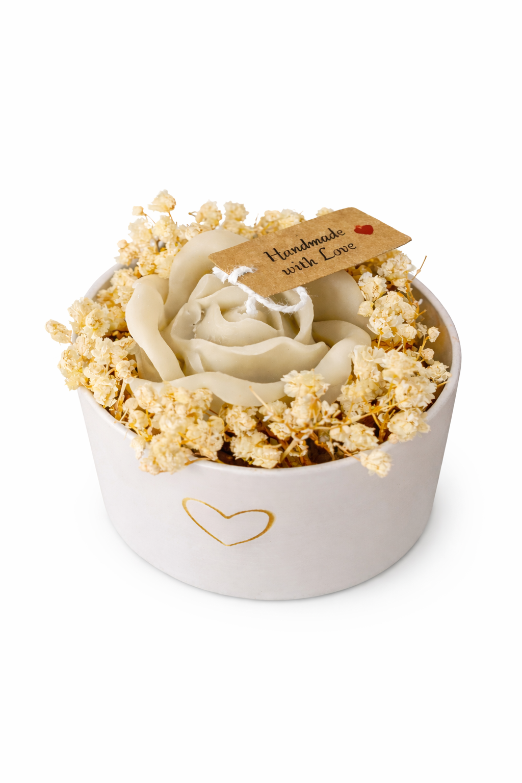 Deze prachtige handgemaakte rozenkaars is een stijlvol en uniek cadeau voor elke gelegenheid. De kaars heeft de vorm van een elegante roos en is omringd door fijne droogbloemen, gepresenteerd in een luxe blikje en subtiel gouden hartje.