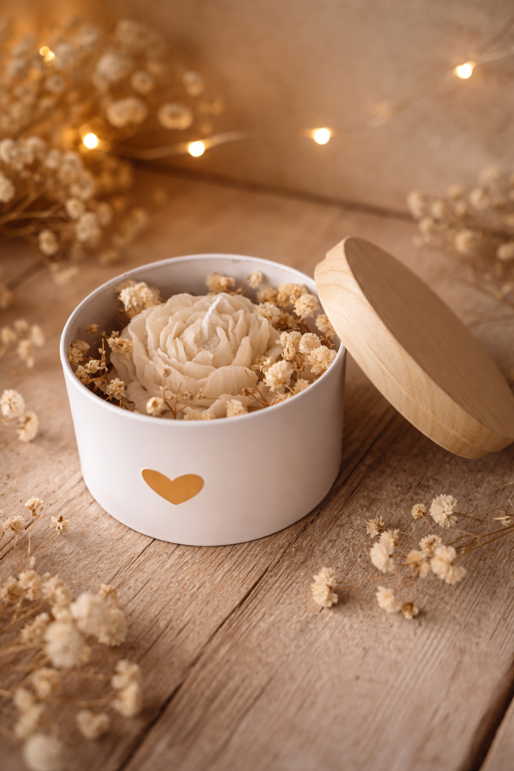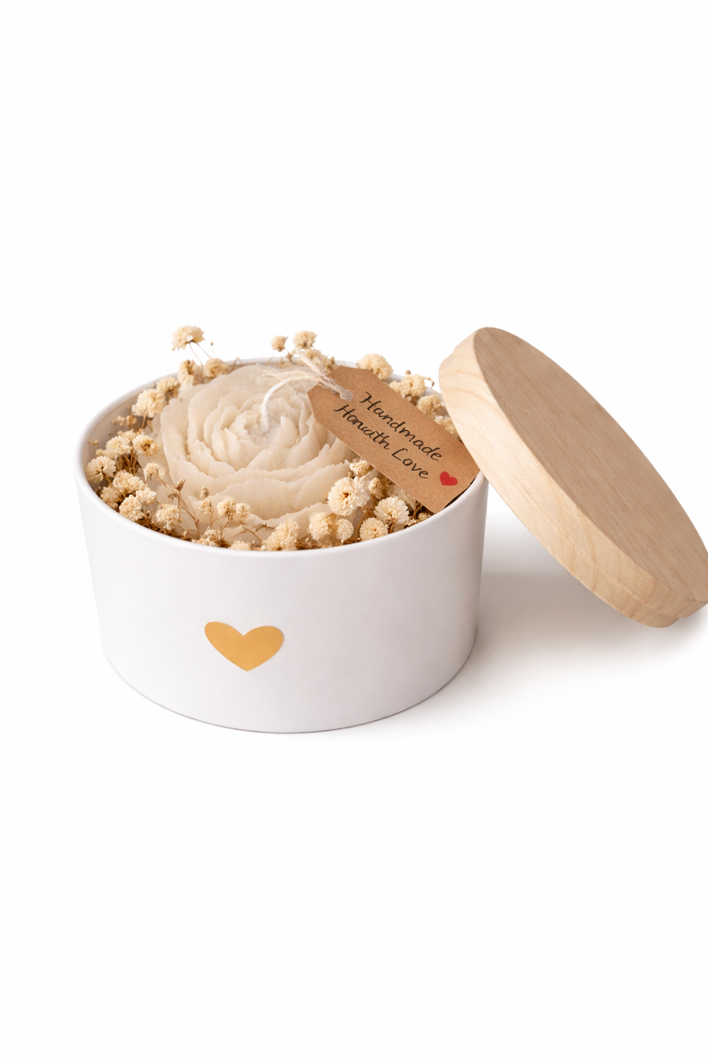 Deze prachtige handgemaakte rozenkaars is een stijlvol en uniek cadeau voor elke gelegenheid. De kaars heeft de vorm van een elegante roos en is omringd door fijne droogbloemen, gepresenteerd in een luxe blikje en subtiel gouden hartje.