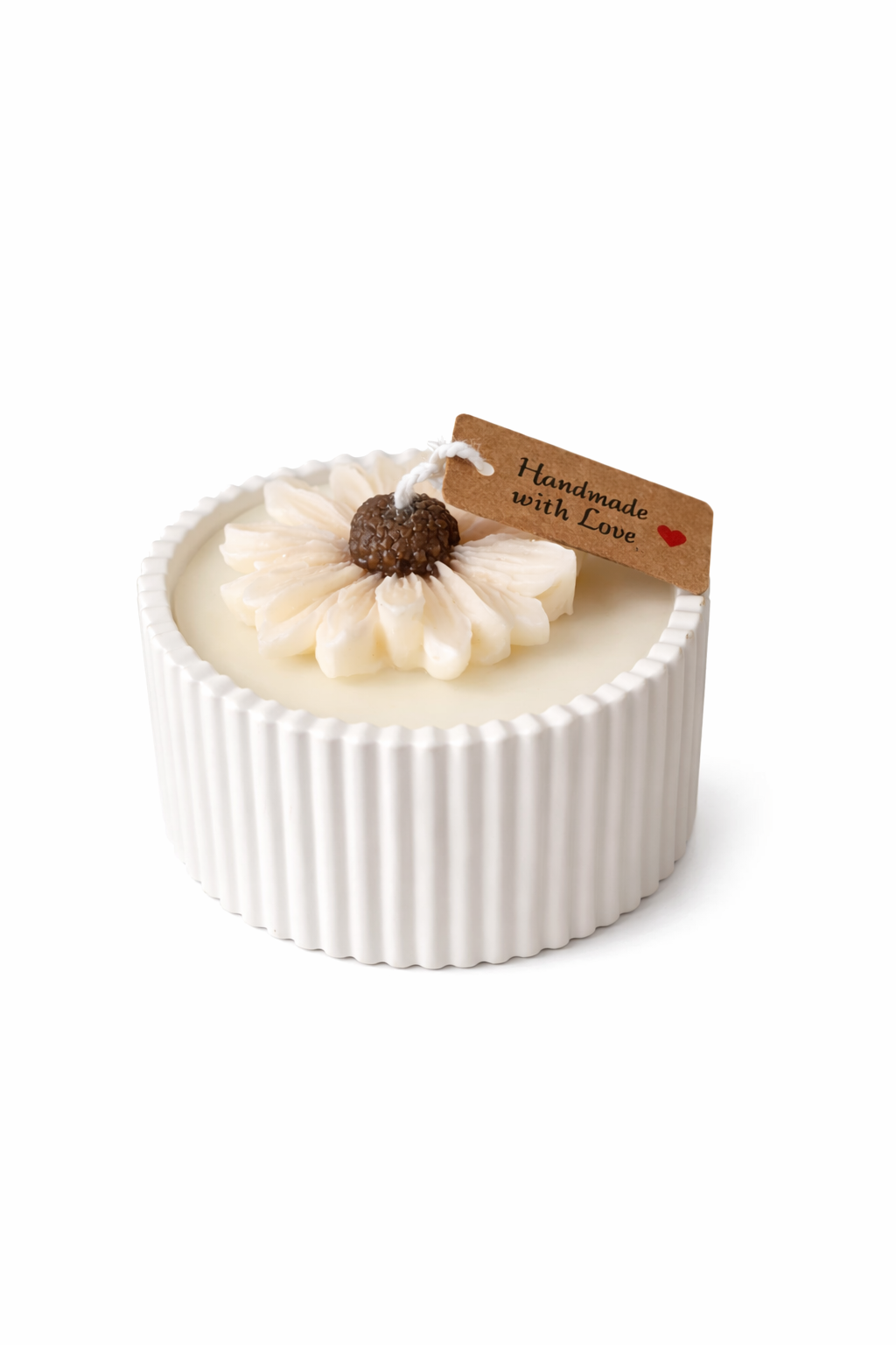 Breng warmte en sfeer in huis met deze stijlvolle handgemaakte kaars van natuurlijke sojawas. De kaars is gegoten in een modern geribbeld potje en afgewerkt met een prachtige bloem bovenop. Perfect als decoratie of als uniek cadeau.